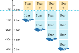 Also der Druck hängt von der Eintauchtiefe h ab. Desto tiefer die Taucher*in eingetaucht ist, desto mehr Wasser befindet sich über ihr/ihm, und desto größer wird der Schweredruck.